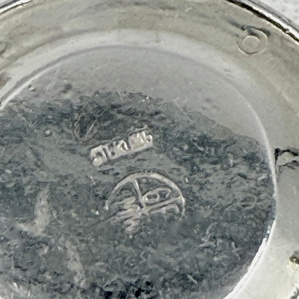 Dinner is served. This whimsical pin was created by the Great Falls Metal Company, known for its highly collectible modernist pieces, often incorporating recycled materials. It features a place setting complete with fish entree. Measures 1 3/4" x 1 1/8" and is  marked "Sterling" on the back, along with the maker's mark.  In excellent vintage condition.